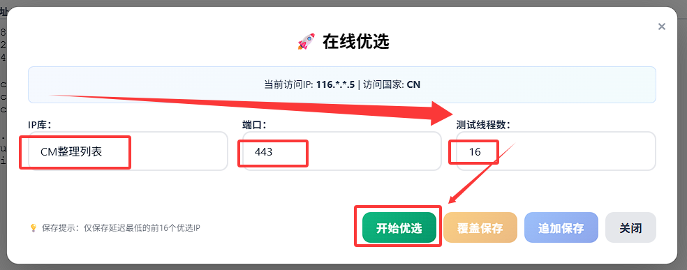 CN环境下,将不被允许使用在线优选功能,因为在代理环境下进行在线优选只会得到你代理的优选,选出来的地区基本上都是你代理所属地区,而延迟也是你代理延迟,可以说是毫无意义的。 - 如果你是身处国外并且直连尝试在线优选,也毫无意义,因为也就只有在