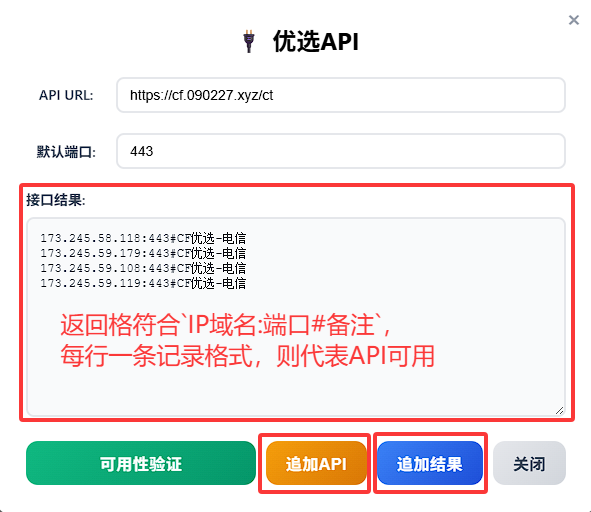 IP域名:端口#备注,每行一条记录格式,则代表API可用;如果仅是一次性导入,无需实时自动更新,则点击